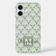 Este estuche para iPhone de bonito presenta un diseño femenino con un patrón de damasco blanco encalado sobre un fondo verde sabio. Hay un nombre inicial monogramado así como un nombre personalizado.