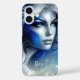 Estuche personalizado para iPhone - Diosa Cabeza celeste azul blanco febrero - Este hermoso flujo, generado por ai, muestra la cabeza de una mujer hermosa con ojos azules y el pelo largo fluyendo en un universo celeste divino, mirando a los lados. Los colores principales de esta pieza Art son diferentes en tonos azules, rosas, rosa claro y blanco. Esto hace un buen regalo para usted y para sus amigos y familia. Puede personalizar el texto - Gracia - a su gusto o eliminarlo.