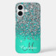 Purpurina IMPRESO azul verde azulado y plateado, personalizado con su nombre y monograma. Acero metalizado de color verde falso. Estuche de teléfono móvil para iPhone 16.