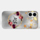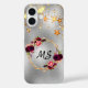 Funda iPhone 16 Flores burdeos plateadas estrellas doradas monogra