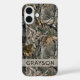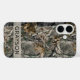 Customize this forest branches camouflage iPhone 16 case with your name in a trendy modern CAP font in gray on opaque cream. It's masculine and perfect for your favorite military, hunting, country or outdoorsman!