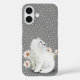 Cuto gato persa blanco con flores de margarita sobre un fondo gris con un minúsculo patrón de puntito blanco.
