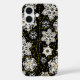 Lujoso y festivo patrón de elegancia de copos de nieve purpurina dorado en delicadas formas florales sobre un fondo negro.