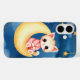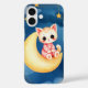 Adorable cream kitten dressed in pink pajamas sitting on a crescent moon surrounded by hanging stars and clouds.