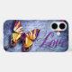 Mariposas y texto de amor sobre fondo azul texturado con obras de arte caligráficas.