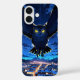 Hermoso estuche de teléfono inspirado en anime con una lechuza volando sobre tejados nevados por la noche bajo un cielo estrellado. Perfecto para diseños místicos y serenos de invierno.