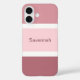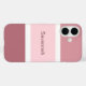 Funda de teléfono celular linda, femenina y simple con un patrón de rayas rosadas y blancas. Múltiples tonos de rayas rosadas grandes y rayas blancas pequeñas. Personalizado con su nombre impreso en un texto rosa.
