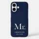 Este elegante y minimalista estuche de teléfono dice "Mr." con un lujoso tipo de letra blanco, moderno y de alta moda sobre azul marino oscuro, y también tiene un lugar para su apellido y fecha boda.