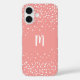El estuche para iPhone de moda en blanco y rosa de coral vibrante cuenta con confeti blanco lloviendo de arriba a abajo, con tu monograma inicial en el centro con letras modernas de caligrafía blanca.