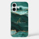 Estuche moderno y elegante para teléfonos celulares con acentos turquesa, verde azulado y purpurina de mármol y oro personalizado con iniciales y nombre manuscritos manuscritos de moda. Póngase en contacto con el diseñador a través de Zazzle Chat o makeitaboutyoustore@gmail.com si desea modificar este diseño, en otro producto o si desea coordinar elementos.