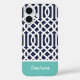 Estuche de teléfono personalizado elegante en tonos azul marino, turquesa y blanco. Este diseño presenta un patrón de enrejado marroquí. Personalízalo con tu nombre u otro texto personalizado en un tipo de letra monograma de escritura moderno. Utilice las herramientas de diseño para elegir cualquier color de fondo, edite los tipos de letra y colores del texto y cargue sus propias fotos para crear una única cubierta de un dispositivo de tipo!