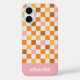 Haga una declaración audaz con este estuche de teléfono personalizado que presenta un patrón de tablero de ajedrez moderno en tonos naranja, rosa y crema vibrantes. Personalízalo con tu nombre en un divertido tipo de letra retro para un toque divertido y único. Perfecto como una idea de regalo para una persona que ama los diseños atrevidos y retro, este funda combina un estilo llamativo con una protección duradera.