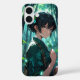 Caso de teléfono anime de alta calidad que representa a un místico guardián del bosque con personal brillante rodeado de criaturas mágicas y luciérnagas. Perfecto para fanáticos de anime y amantes de paisajes mágicos.