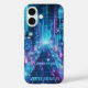 paisaje urbano futurista de neón, calles iluminadas con luces azul y violeta brillantes al estilo ciberpunk, signos holográficos, diseño minimalista y elegante, formato vertical