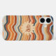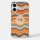 Estriberas retro de moda de los años 70 de diseño de olas de color de agua para un estuche personalizado para iPhone. Con letras iniciales, iniciales, monograma. Accesorio de moda para proteger tu celular o un regalo creativo y creativo para ella. Seguramente será apreciado y admirado. La combinación de colores es específica, con vibraciones de atardecer retro, terracota boho, naranja, crema, beige, gris, azul.