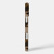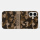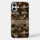 Customize this multi-hued brown camouflage iPhone 16 plus case with your name in a trendy modern CAP font in dark brown on light brown. It's masculine and perfect for your favorite military, hunting, country or outdoorsman!