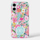 Customize this gorgeous modern colorful flower garden of flowers in pink, purple, blue and yellow iPhone 16 plus case with your your initials in a modern CAP font in white on blue. It's so vibrant and happy!