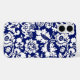 Estuche de teléfono en un patrón vintage de damasco floral William Morris, realzado digitalmente y coloreado, en blanco sobre fondo azul cobalto profundo