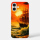 Este estuche de teléfono tiene un barco en el océano.
