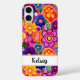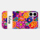 Haz una declaración retro con esta divertida funda para iPhone 16 plus inspirada en la década de 1970 con el poder floral hippie. Es moderna y trendy con flores pintadas de colores brillantes. Haz que sea única con tu nombre en una fuente de letra moderna en negro. ¡Se verá fabulosa en tu teléfono!