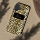 Una estuche de teléfono elegante y de lujo con un nombre en marcos dorados con fondo negro. El diseño es un patrón de hojas negras sobre un fondo dorado brillante con algunos destellos resplandecientes. (el producto no tiene verdadero brillo o purpurina). Agregue su nombre y cree un funda elegante personal.