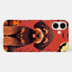 Una ilustración de estilo cartoon de un perro marrón alegre sentado entre decoraciones temáticas de Halloween. El fondo es un naranja atardecer con una gran luna amarilla y varios murciélagos volando.