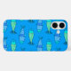 Estuche de teléfono en un patrón de pescado retro, moderno, caprichoso, de color turquesa, acuático, verde cal y azul cielo, sobre un fondo azul ceruleño profundo