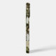 Customize this pine and leaves camouflage iPhone 16 plus case with your name in a trendy modern CAP font in brown on opaque cream. It's masculine and perfect for your favorite military, hunting, country or outdoorsman!