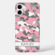 Customize this pink, gray and white camouflage iPhone 16 plus case with your name in a trendy modern CAP font in gray on white. It's so modern, girly and trendy! Perfect for any country girl!