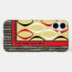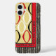 La imagen original que adorna este funda del iPhone 16 es una mezcla ecléctica de patrones, desde un patrón de rayas grises y marfil de carbón grungo hasta el modelo de anillo oblongo modernizado de los años 50 con anillos negros, blancos y rojos en un fondo de crema que inicialmente fue inspirado por un diseño textil africano. 2 campos de texto de personalizable para tu nombre o pie de foto se sientan encima de los bordes interiores rojos de tomate.