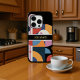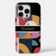 Custom Name Modern Abstract Geometric iPhone 16 Pro Cases features black, blue orange and red, pink watercolor geometric shapes with stripes and your personalized name in modern golden script. Personalize by editing the text in the text box below.