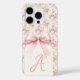 Monograma Bow Rosado Coquette iPhone 16 Pro Funda con letra monopólica guionada por bonito y fondo de pantalla grande de arco rosado y rosas vintage.