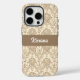 Un hermoso patrón vintage de damasco en beige sobre un fondo de color marrón pálido crea una elegante caja para iPhone. Personalice su nombre en una banda de color beige oscuro en el medio.
