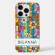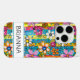 Make a retro statement with this groovy 70s inspired hippie flower power iphone 16 pro phone case! It's modern and trendy with bright multi-colored watercolor flowers. Make it uniquely yours with your name in a mod CAP font in black. It will look fabulous on your phone!