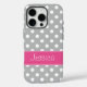 En este estuche preppy para iPhone se presenta un diseño de puntos polka gris y rosado. ¡Fácilmente personalizable con tu nombre!