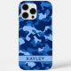 Personaliza esta funda de iPhone 16 pro max con camuflaje azul con tu nombre en una fuente moderna y trendy CAP en azul oscuro sobre azul claro. ¡Es muy moderna, femenina y trendy! ¡Perfecta para cualquier chica de campo!
