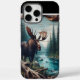 Un encendedor personalizado de madera tallada con un cuadro de un alce de toro sobre un río de pinos de fondo.