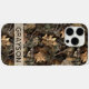 Customize this fall leaves camouflage iPhone 16 pro max case with your name in a trendy modern CAP font in brown on opaque cream. It's masculine and perfect for your favorite military, hunting, country or outdoorsman!
