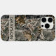 Customize this forest branches camouflage iPhone 16 pro max case with your name in a trendy modern CAP font in gray on opaque cream. It's masculine and perfect for your favorite military, hunting, country or outdoorsman!