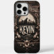 Un escudo ornamentado con el nombre de Kevin, enmarcado por hojas y viñas, con una escena montañosa y estrellas en el fondo.