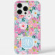 Customize this gorgeous modern colorful flower garden of flowers in pink, blue, purple and yellow iPhone 16 pro max case with your your initials in a modern CAP font in white on blue. It's so vibrant and happy!
