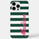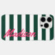 Crea tu propio estuche de teléfono monograma personalizado con rayas de cabana verdes y blancas que te marcan el patrón de tu nombre personalizado en tipografía de escritura retro.