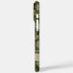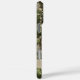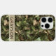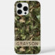Customize this pine and leaves camouflage iPhone 16 pro max case with your name in a trendy modern CAP font in brown on opaque cream. It's masculine and perfect for your favorite military, hunting, country or outdoorsman!