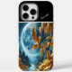 Un águila encaramado en una rama de árbol dorado mira a una luna llena sobre un océano brillante. Un fantástico paisaje se despliega bajo la brillante órbita.