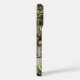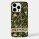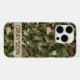 Customize this pine and leaves camouflage iPhone 16 pro case with your name in a trendy modern CAP font in brown on opaque cream. It's masculine and perfect for your favorite military, hunting, country or outdoorsman!