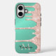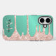 El estuche de teléfono móvil verde azulado y purpurina de goteo rosa se puede personalizar con tu nombre y monograma.