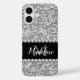 Funda iPhone 16 Purpurina plateado y gemas con nombre y monograma