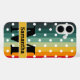 Estuche de teléfono de estilo retro con un patrón de puntos de polka blanco sobre un fondo colorido de rayas de paleta de color retro. Hacia la parte inferior del funda hay dos plantillas. Uno para añadir tu inicial con letras negras y el otro para añadir tu nombre, también con letras negras dentro de una franja amarilla a través de la inicial.