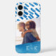 estuche de teléfono monogramado por personalizado con un patrón abstracto de color de agua boho en colores azul y blanco. Personalízalo con sus iniciales de monograma u otro texto. Utilice las herramientas de diseño para agregar la foto de su personalizado y editar los tipos de letra y los colores del texto para crear un diseño único.
