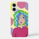 Diseño colorido, luminoso y abstracto de la cara estilizada de un chica de pelo rayado, con un fondo de círculos.